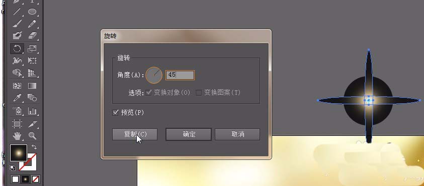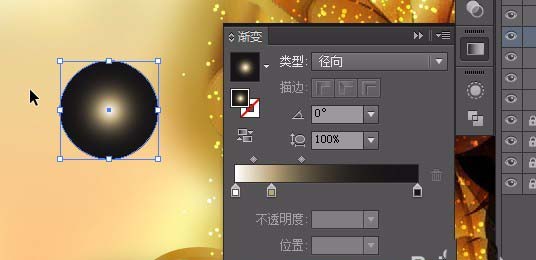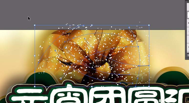15、调整文字的位置。将上面的散点群组复制一份到下面的花。效果如图。选择椭圆工具。绘制一个正圆。大小为52x52mm ,添加渐变色①#ffffff②位置20%:#bca77a③#000000 第二个渐变滑块位置20%。如图。渐变模式:径向。用椭圆工具绘制一个椭圆如图。双击选择工具,调整角度为90°。点击复制。效果如图。