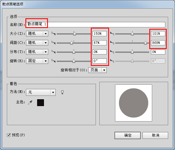 到此完成第1种自定义艺术画笔;接着进行第2种艺术自定义画笔制作,切换到圆形工具随意画一个正圆形填充任意色取消描边色,分别进行两个自定义散点画笔,散点画笔设置分别如下图