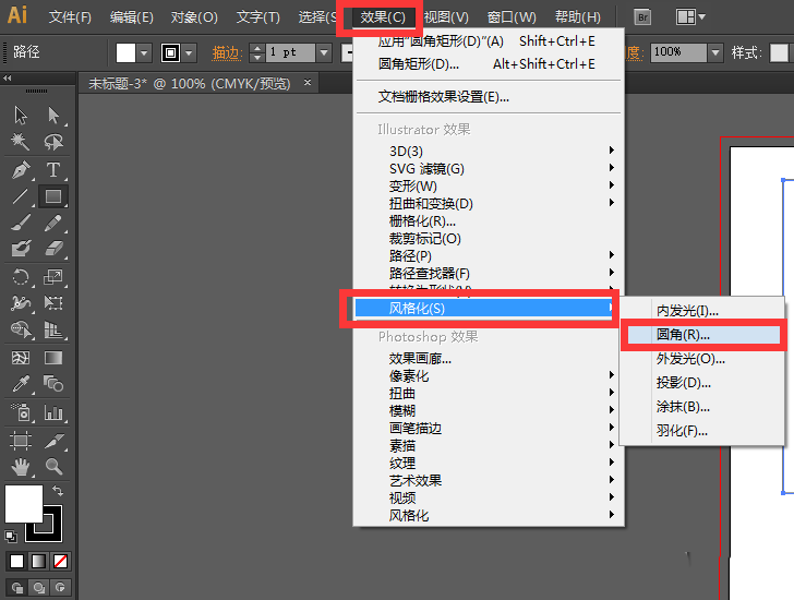 2、这时候绘制的矩形时没有圆角的。执行菜单栏中的效果—风格化—圆角,