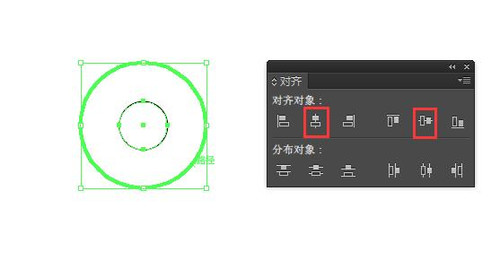 4.绘制一个54*54的圆,和刚刚的大圆居中对齐。选择工具(V)选中两个圆,在用鼠标左键点一下大圆,使大圆成为参考位置,打开对齐面板(Shift+F7),选择水平居中对齐和垂直居中对齐。