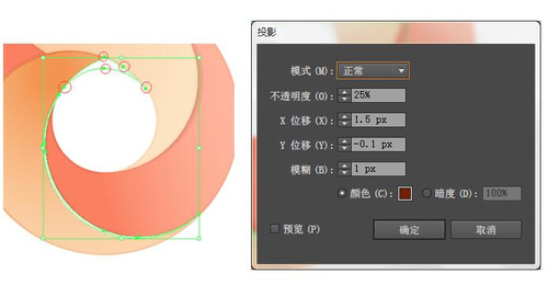 21.选择下图所示的圆,向前复制一层(Ctrl+C>Ctrl+F),选择复制层,向上移动2个像素。选择区域①,同样向前复制一层。选中这两个复制层,在路径查找器面板中选择交集,再使用删除锚点工具删除下图圈出来的锚点,适当的调整一下曲线,使得弧度更加自然,填充白色,不透明度80%。选择效果>风格化>投影,参数如下图所示。