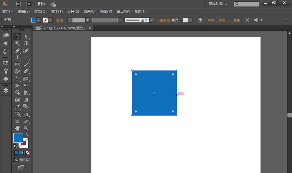 2、选择【选择工具】,正方形的直角上的锚点沿中心的方向拖动,将直角变成圆角,如图: