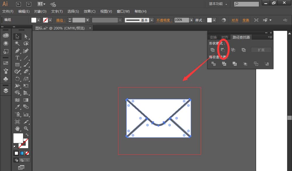 8、将绘制的信封图形选中,然后找到【路径查找器】选择【减去顶层】,做出了镂空的效果,如图: