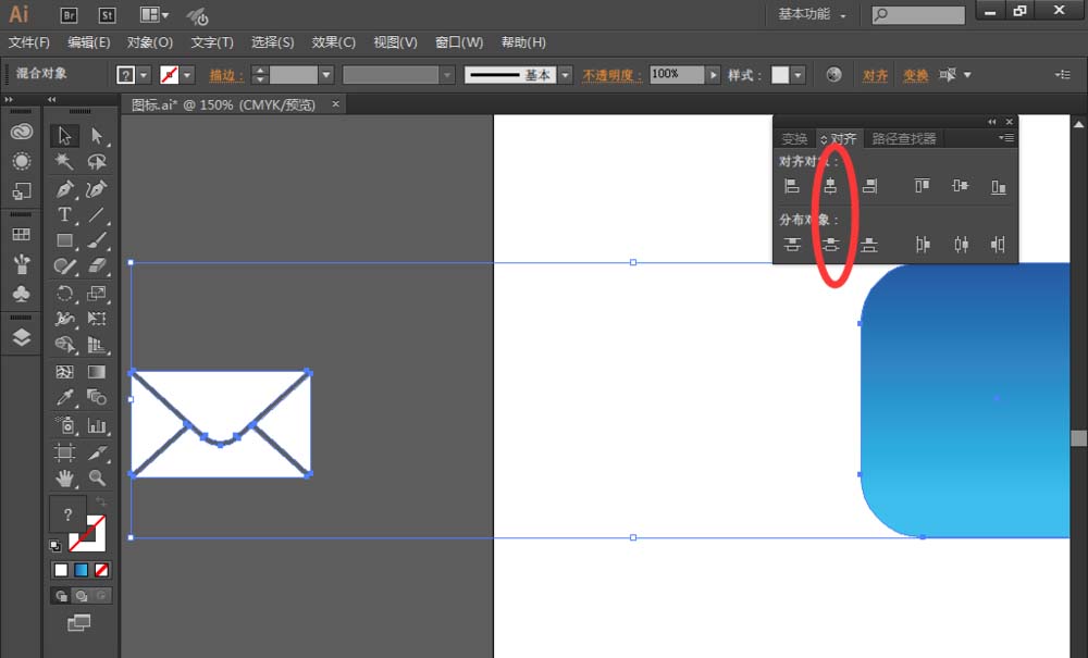 9、选择信封图形和背景图形,点击背景图形,然后然后找到【对齐】选择【水平居中对齐】、【垂直居中分布】,如图,邮件图标就绘制完成啦!