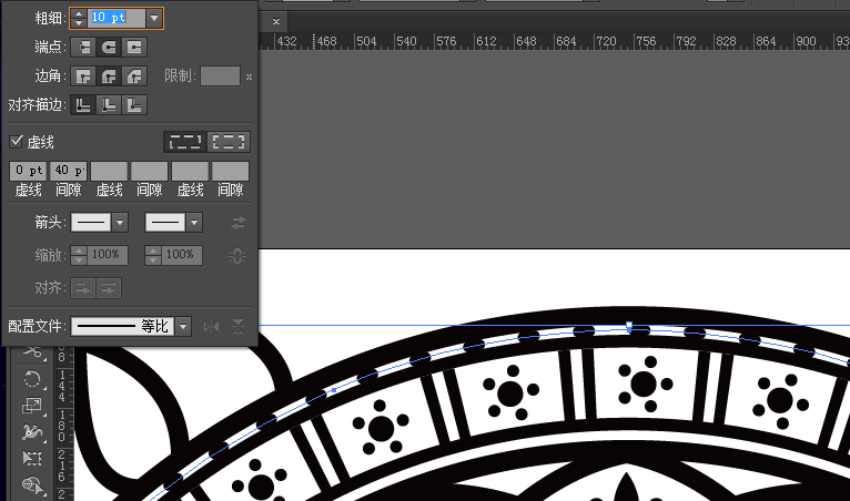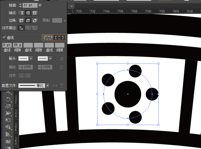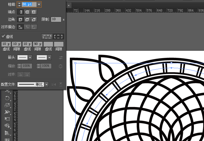 ①选择内数第二个大圆,偏移路径36px,描边66pt,设置虚线参数,如图。