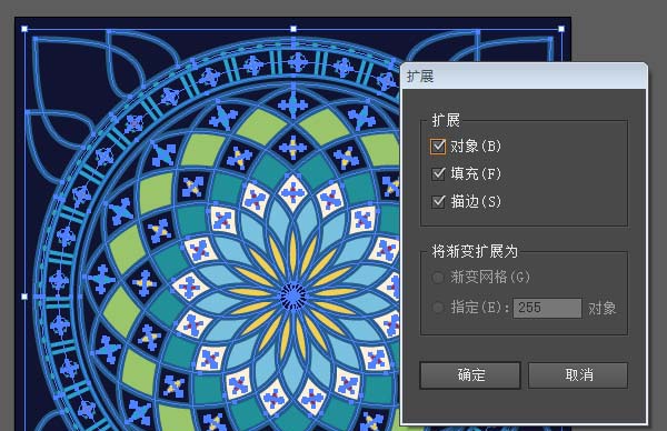 ⑤选中所有的图形,对象-扩展外观,再次对象-扩展,这样所有的描边都成为形状,接下来使用实时上色工具,给原来的描边形成的空隙填充颜色。