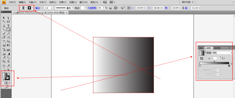 2、我们直接在我们的画布中画出一个矩形图案,然后再点击“渐变工具”,给我们刚才画出来的矩形图案填充渐变色。如下图