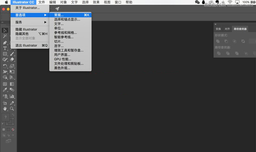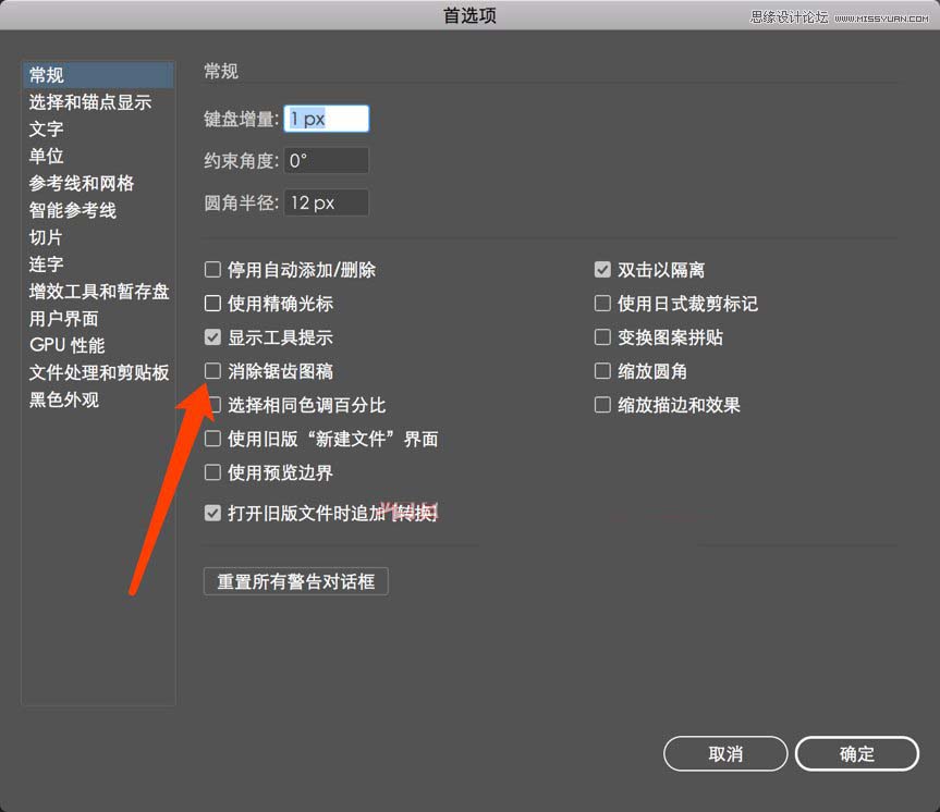 首先打开AI 然后调出首选项,确定消除锯齿图稿没有修改(注意是不要勾选)然后点击确定即可。