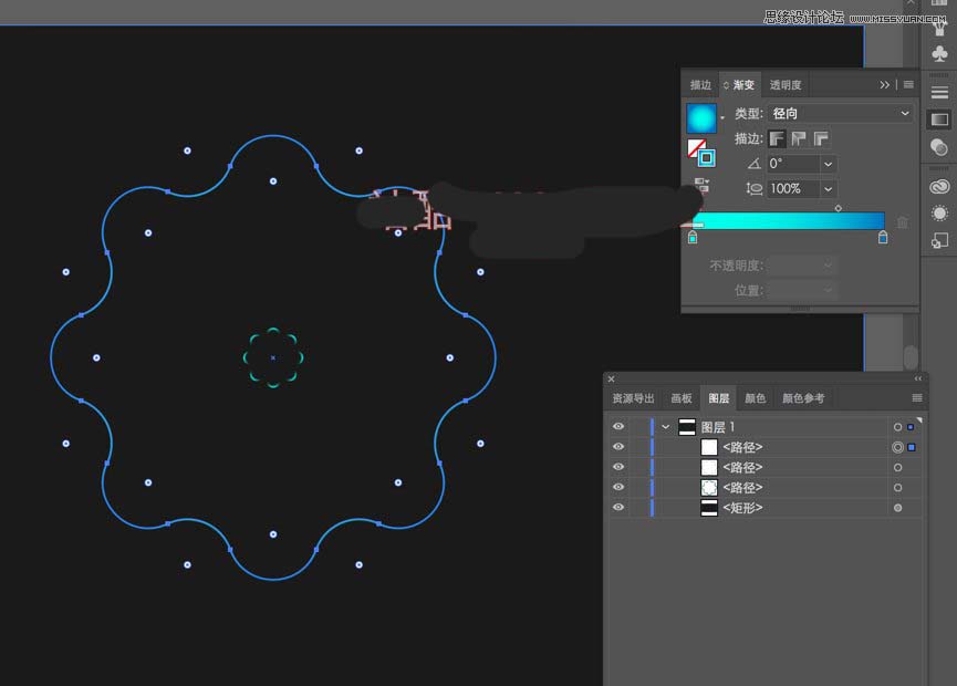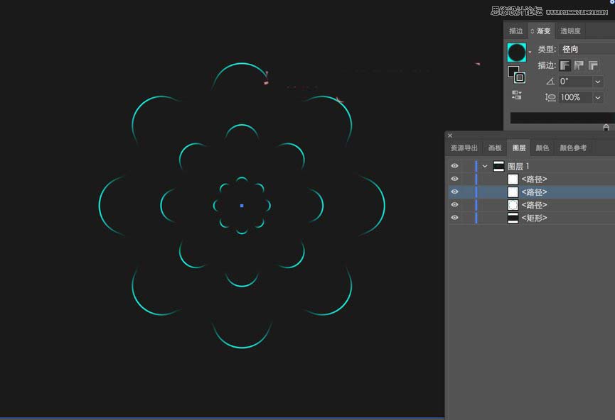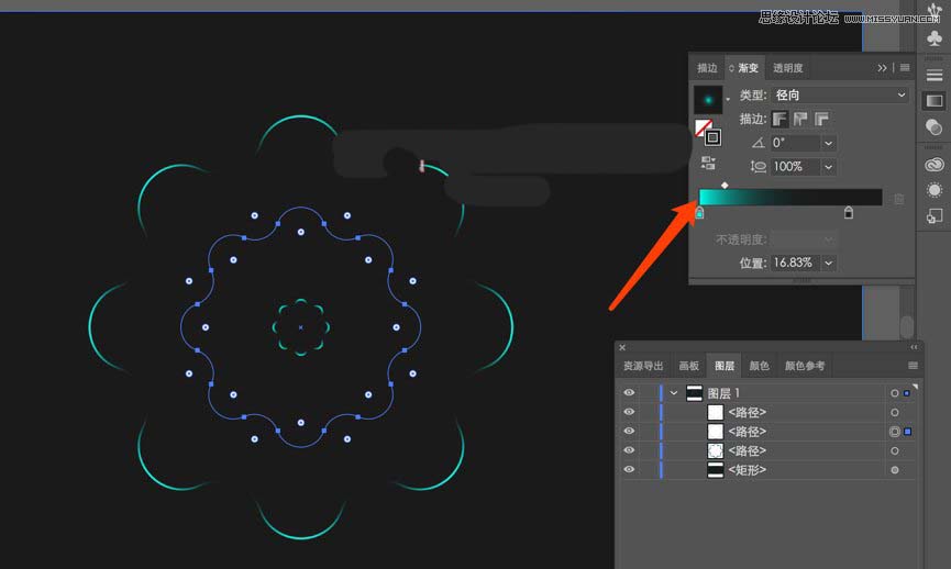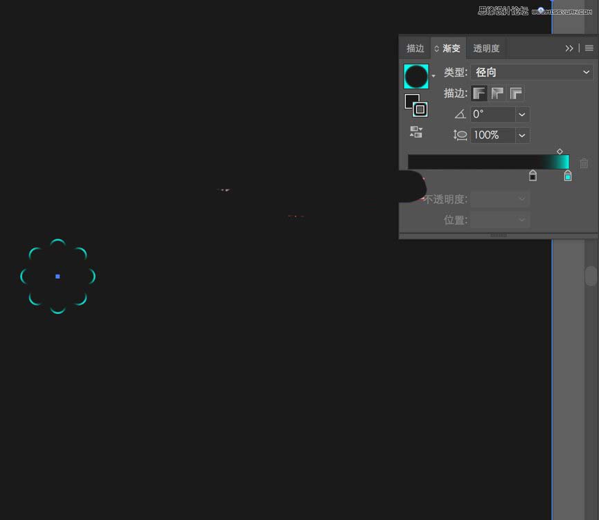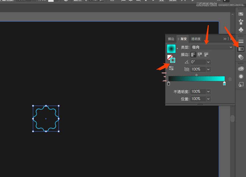 然后选中图形,点击左侧渐变,注意是描边放在最上面,要没就是渐变填充了,然后为径向渐变。