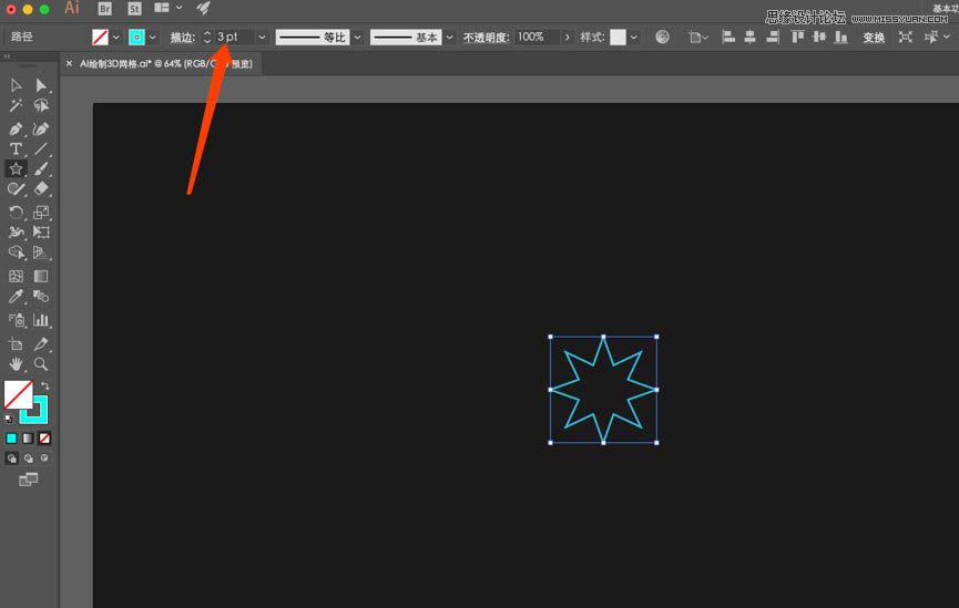 然后选中星形,开启描边关闭填充,描边宽度为3PT,颜色为00FFEC