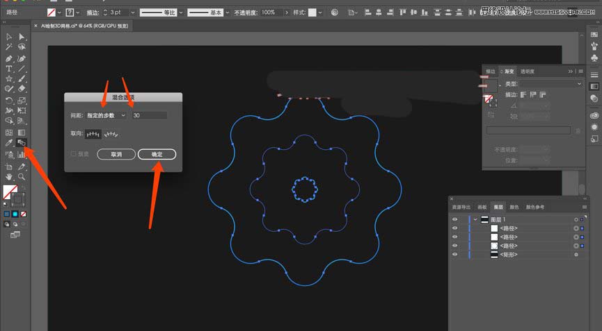接下来选中三个环,然后点击左侧混合工具 设定指定步数为25,然后点击确定。