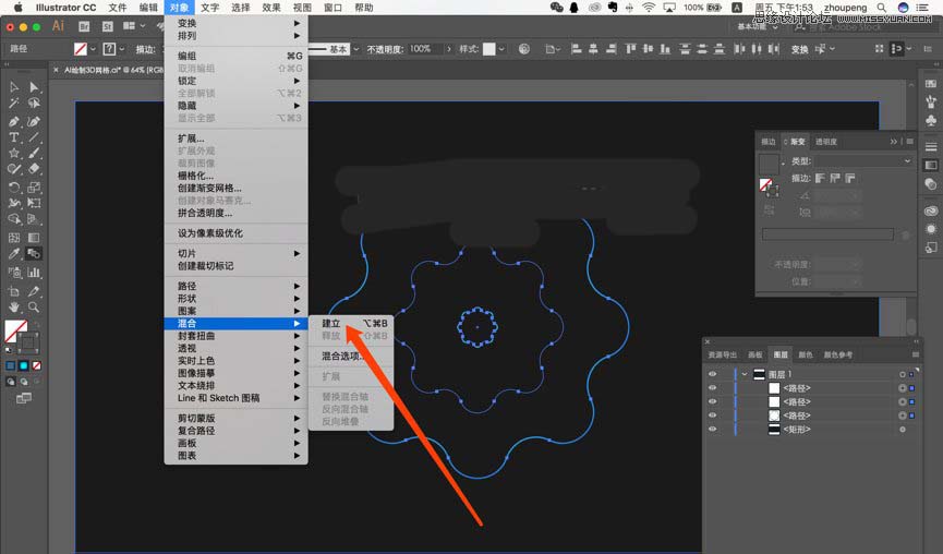 然后继续选中三个,点击对象-混合-建立 。