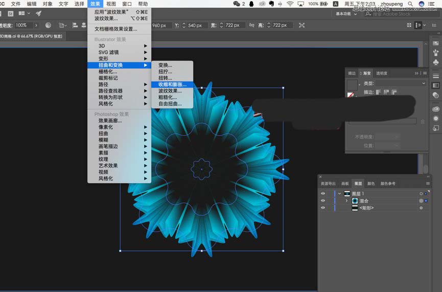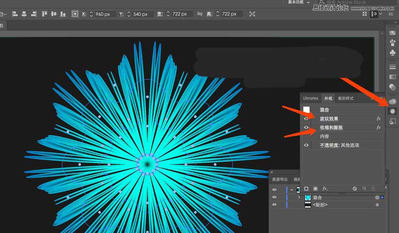把收缩和膨胀这个效果拖到效果波纹上面就好 得到如下效果 完美