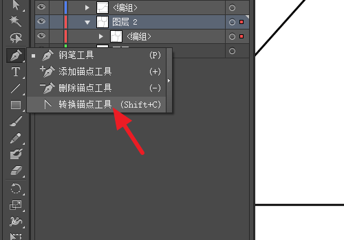 4、如果想要将直角变为弧线,找到钢笔工具下的【转换锚点工具】