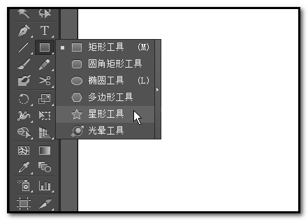 1、在界面左侧的工具箱这里,找到矩形工具按钮,如图中所示,鼠标长按矩形工具,弹出子工具,点击:星形工具