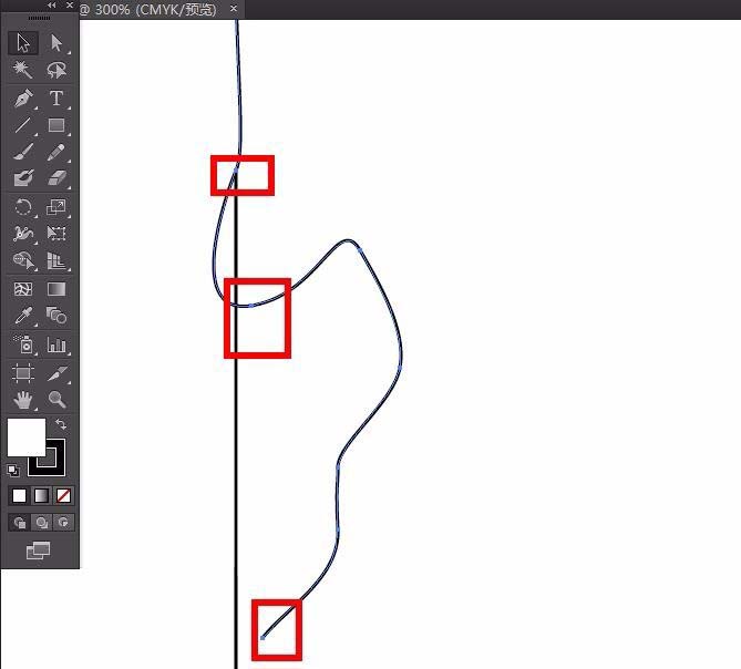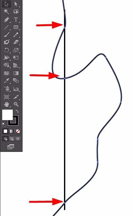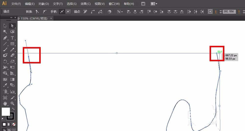6、我们通过垂直直线可以看到,三个锚点处于同一线上。这种操作适用于多锚点的精细调整。对于细节要求较多的图形处理非常方便。