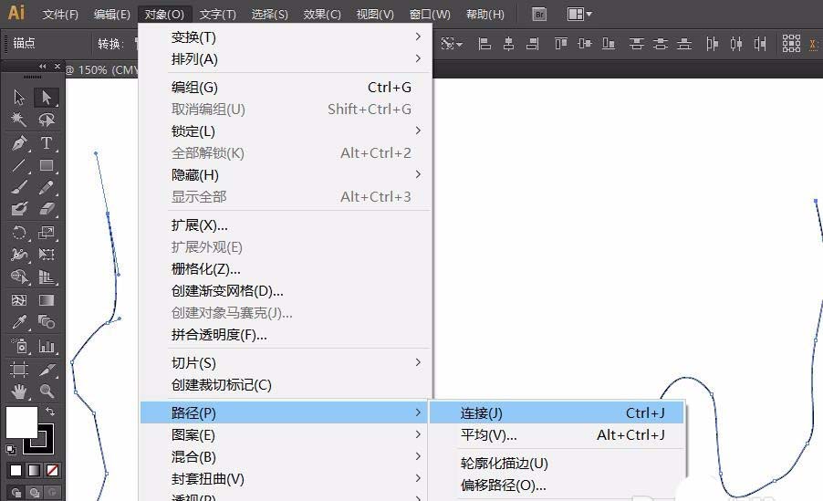 3、选择好两点之后,我们点击对象,路径,连接。从下图可以看到,选中的两点连接了起来。