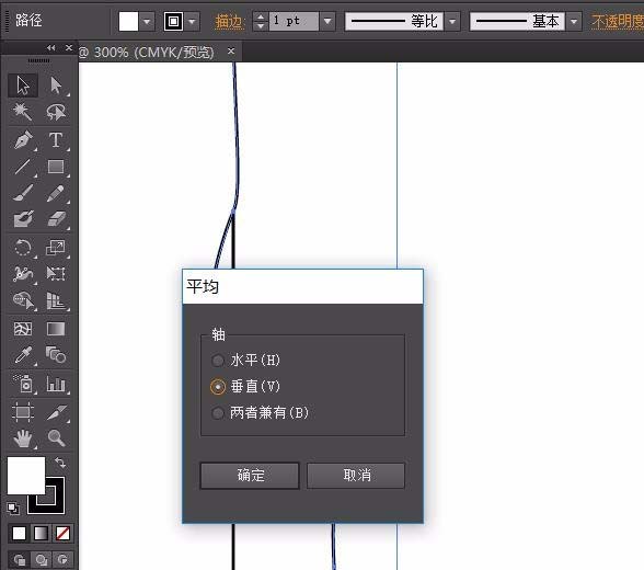 4、下面来介绍下平均锚点功能,我们随便画一个线段,通过垂直直线我们可以看到,三个锚点并不在统一垂直线上。