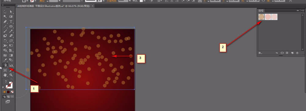 2.选择椭圆工具。在页面中绘制一个正圆。并按alt键,复制两个。第一个颜色值#b1742e,改变属性栏不透明度改为50%,第二个颜色值#fb4b1b ,不透明度为25%,第三个#fb4b1b,不透明度为15%;将它们丢到符号面板【ctrl+shift+f11】里。