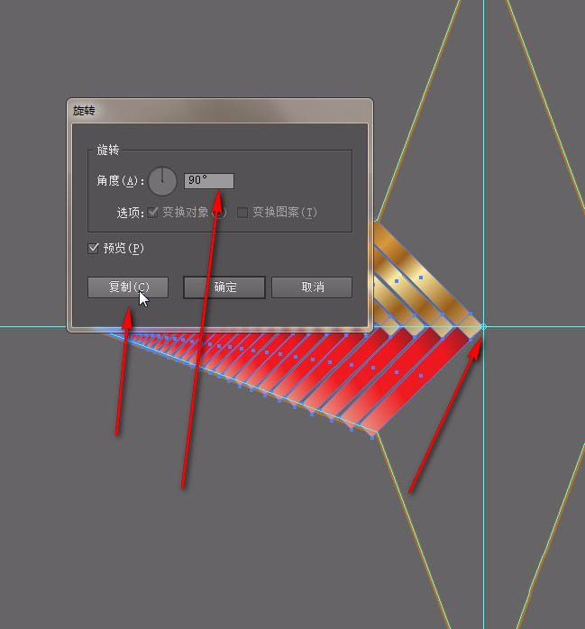 8.按R快捷键【旋转工具】按住alt键的同时将中心点移动要想星星中点。弹出了对话框之后停止按alt,角度:90°。点击复制。对话框输入90°。点击复制。然后按ctrl+D再制。框选整个星星全组。这样一个编制样式的星星就绘制完成了