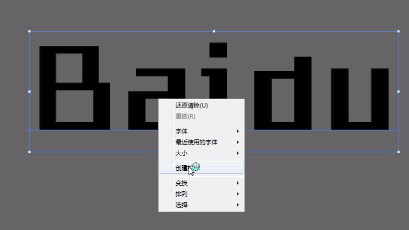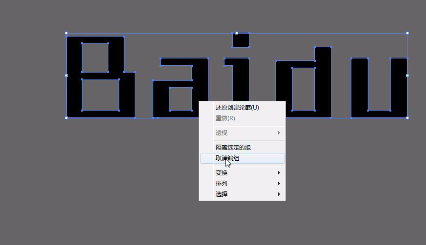 11.例如绘制百度的拼音,B,输入文字。右键点击创建轮廓。然后右键取消编组。 用直接选择工具选择节点。用比例缩放工具缩小。内部。如图。再将色块拼贴上去。如图。