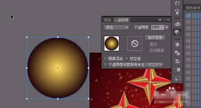 12.绘制高光部分。选择椭圆工具,按住shift键,绘制一个正圆。用吸管工具吸取背景的颜色。在透明度面板里,改混合模式为滤色。然后放置在页面上。框选所有对象。群组。