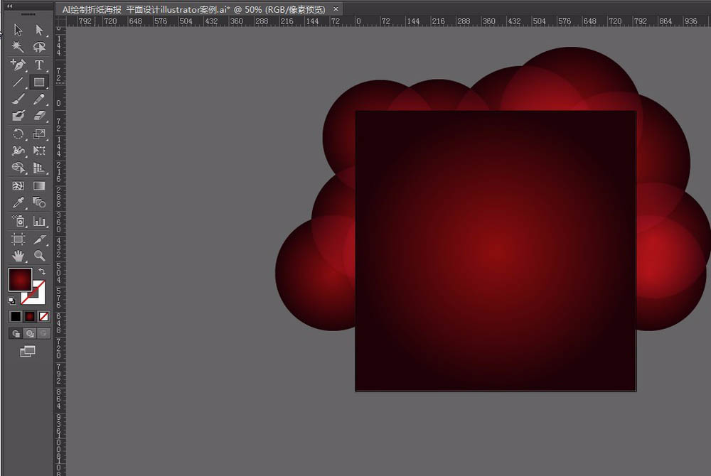 1.绘制一个800x800像素的矩形。颜色模式为RGB.如图。绘制一个矩形。填充径向渐变色。①#8c0d0e②#1c0206,按G调整渐变条的位置。按ctrl+2锁定对象。