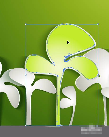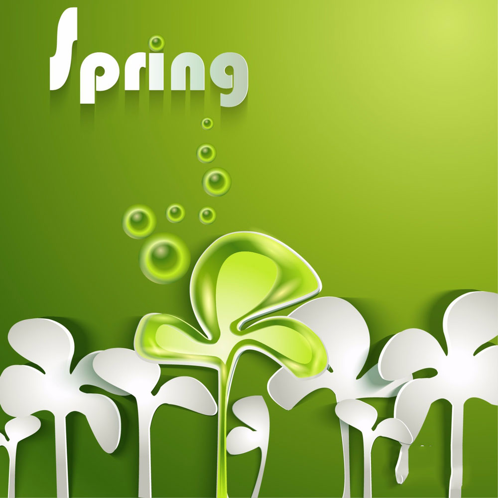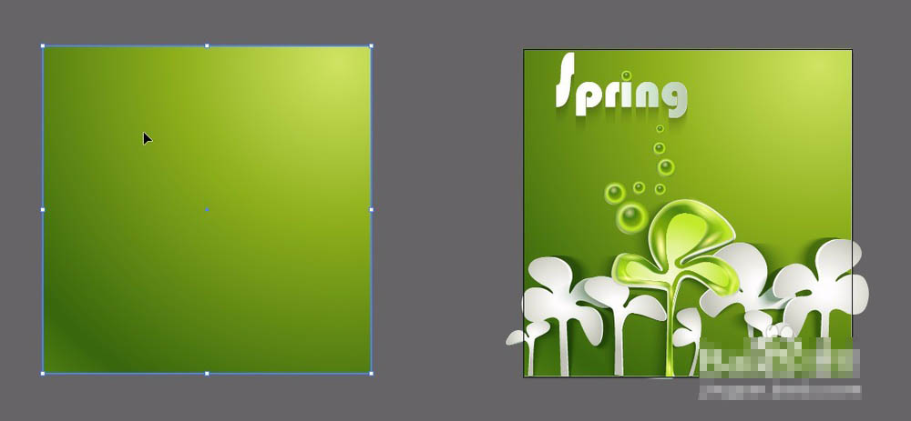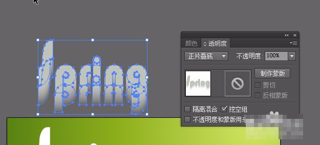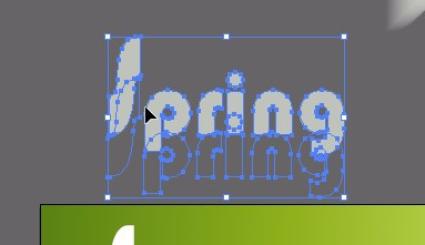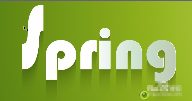 12.输入文字,spring ,字体为:华为琥珀。点右键创建轮廓。点右键取消编组。将S拉长一些。框选文字。ctrl+G编组。给文字填充白色。按ctrl+c;ctrl+F复制一层在上面。按方向键往左移动一点。填充线性渐变色。①位置29:#ffffff②位置70:#cbe3cc③#bdcdb3;按G调整渐变条如图。