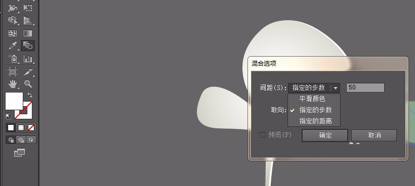 3.按alt键,复制一层。填充白色。按alt键,再复制一层。填充#87a58c;将白色那层的透明度改为o%;双击混合工具,在混合选项里,间距:【指定步数】【50】点击确定。选中这两个,按ctlr+alt+B调和。混合模式改为:正片叠底。