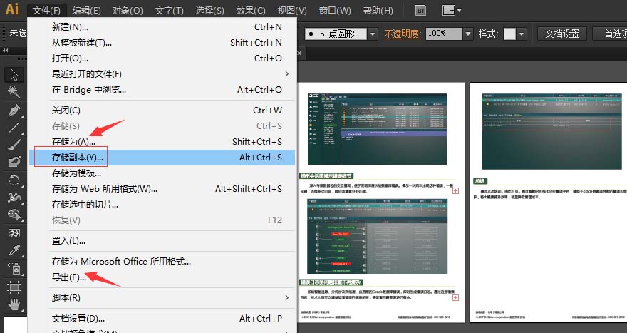 3、文档编排完成后,接下来就是要导出文档,并且以PDF的格式导出。请注意,单击文件菜单后,在下拉框中选择“存储副本”(选择“存储为”也可以导出PDF文档,但是有时会出现覆盖的问题;而选择“导出”就无法导出PDF文档的格式)。