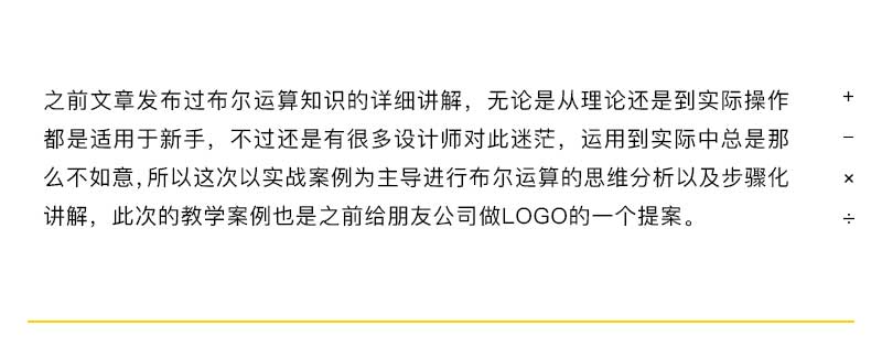布尔运算:实战教学/思维分析:之前文章发布过布尔运算知识的详细讲解,无论是从理论还是到实际操作都是适用于新手,不过还是有很多设计师对此迷茫,运用到实际中总是那么不如意,所以这次以实战案例为主导进行布尔运算的思维分析以及步骤化讲解,此次的教学案例也是之前给朋友工作做LOGO的一个提案