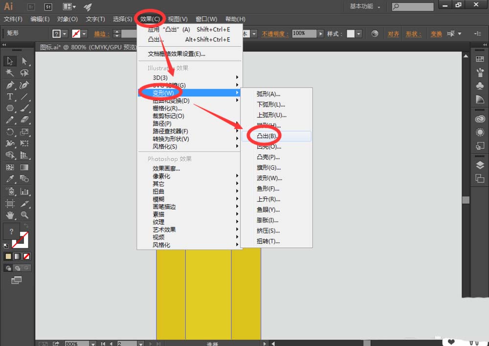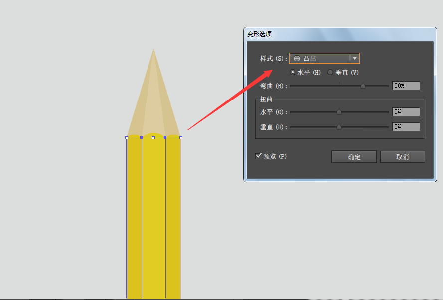 5、然后选择组成笔主体的三个矩形,找到【效果】-->【变形】-->【凸出】,在【变形选项面板】中输入如下参数: