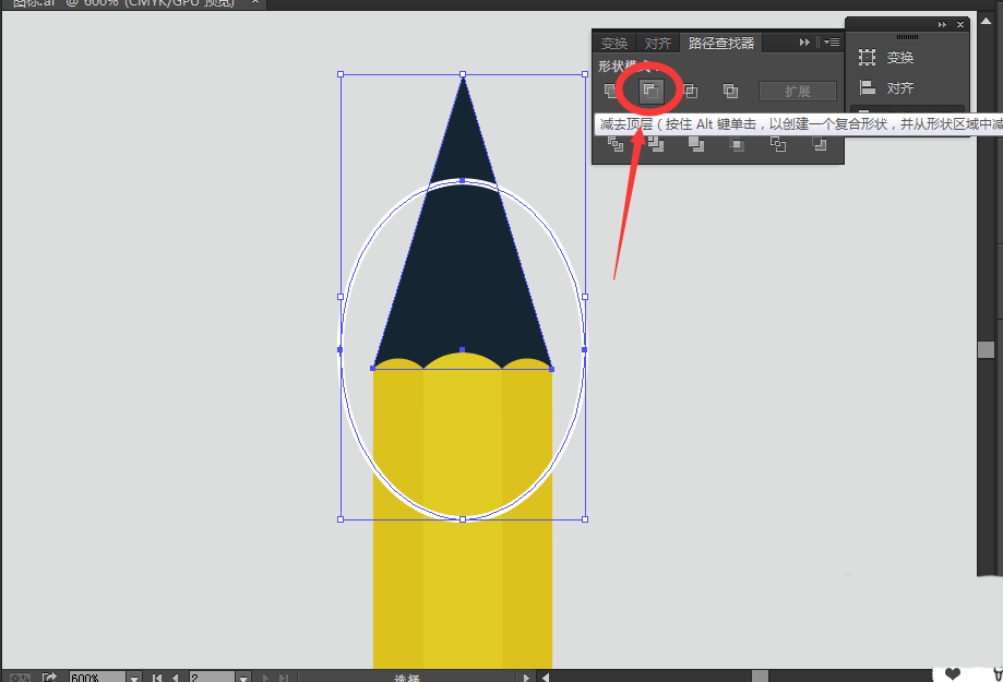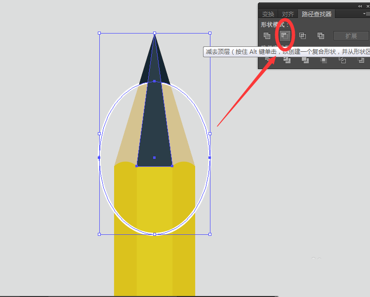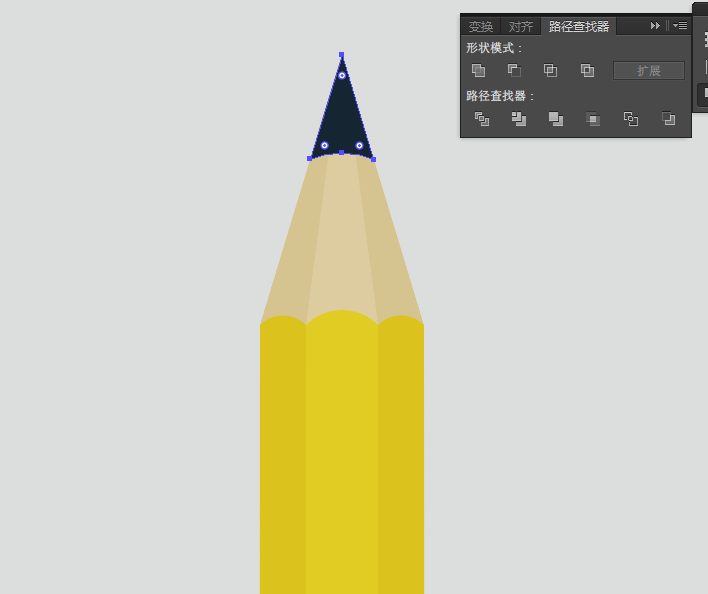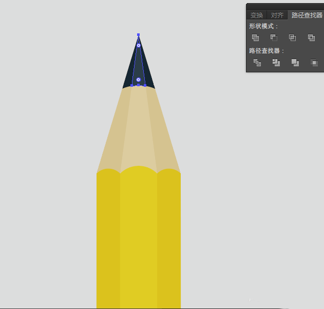 9、同时选中该椭圆、深灰色大三角形,找到【路径查找器】选中【减去顶层】,得到铅笔的笔尖图形,如图:
