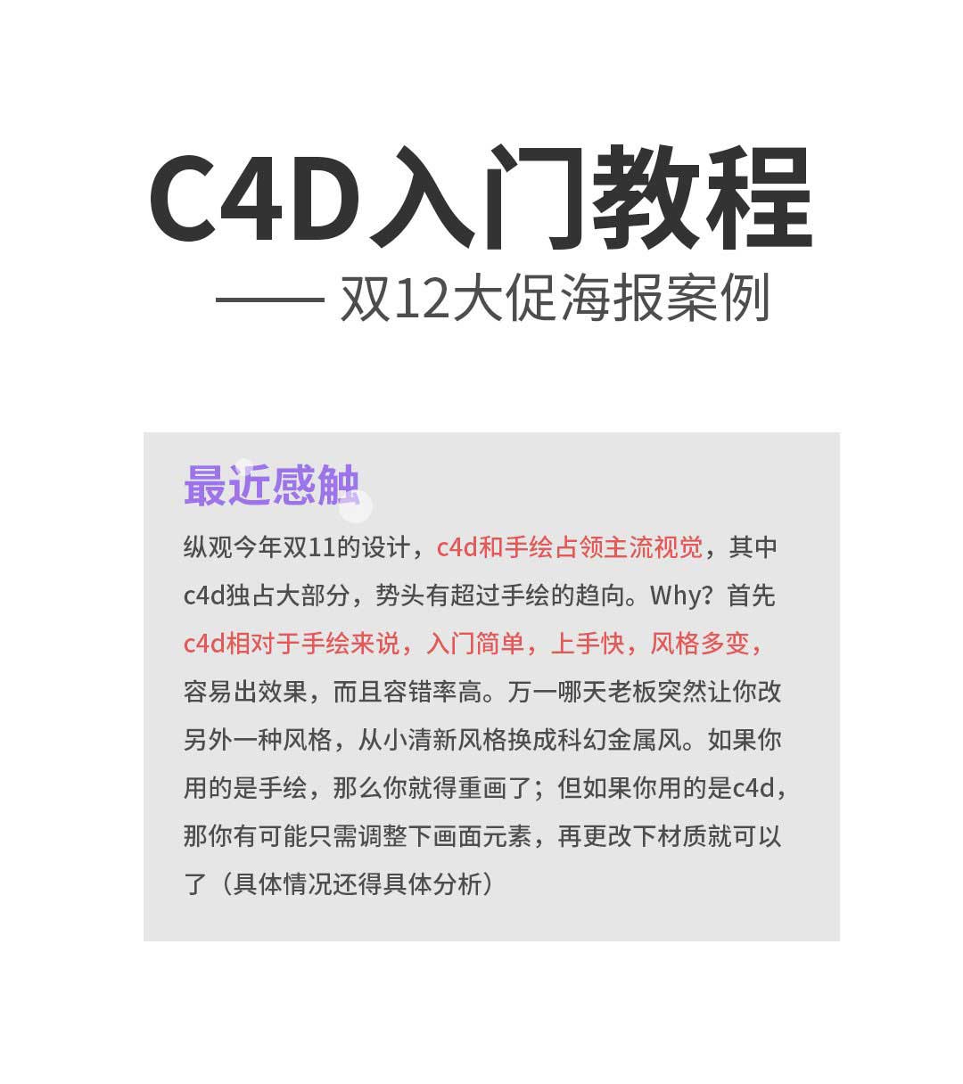 纵观今年双11的设计,C4D和手绘占领主流视觉,其中c4d独占大部分,势头有超过手绘的趋势。WHY?首先c4d相对于手绘来说,入门简单,上手快,风格多变,容易出效果,而且容错率高......那么,接下来作者就教大家使用AI结合C4D结合PS制作双12大促海报,AI主要是造字,c4d用到的知识点有文字挤压、样条扫描以及打光&材质制作,PS是后期处理,具体步骤如下。