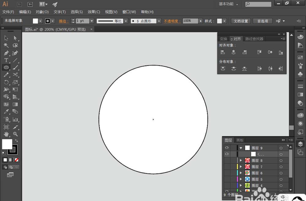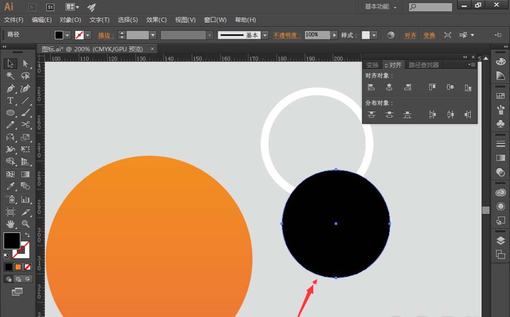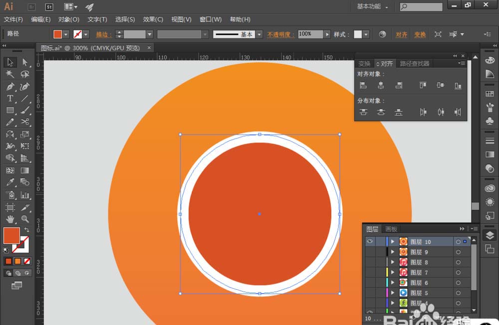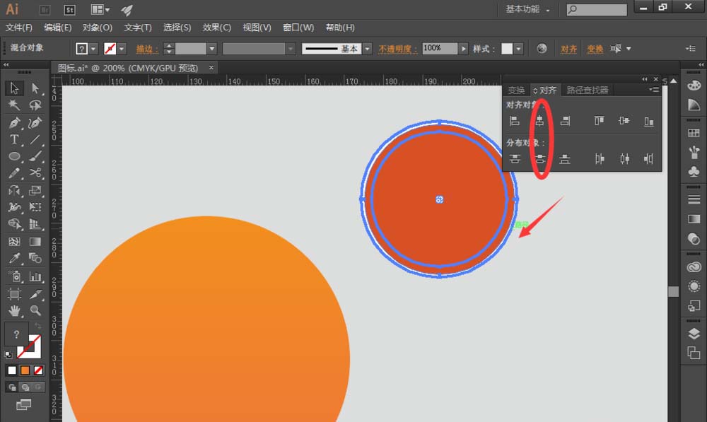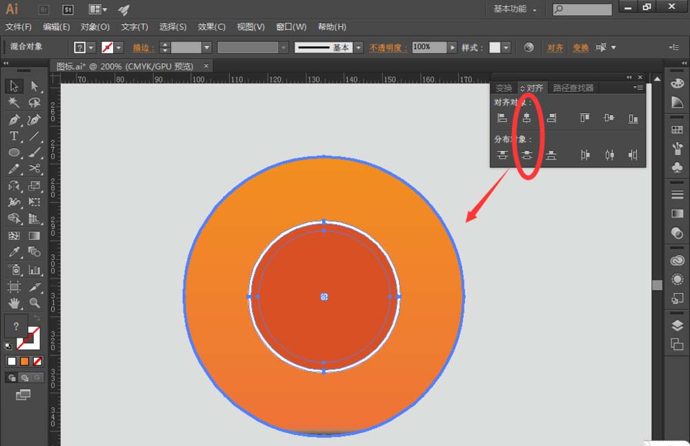 3、选择【椭圆工具】,绘制一个圆,跟圆环大小差不多,添加填充色为深橘色 (#e45221);同时选择圆环和深橘色圆,找到【对齐】,选择【水平居中对齐】和【垂直居中分布】,让深橘色圆相对圆环水平垂直居中对齐,如图: