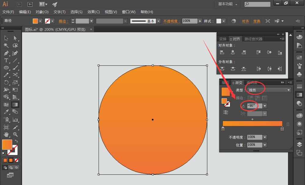 1、打开AI软件,新建文档,选择【椭圆工具】,绘制一个圆作为背景,填充色为底部深橘色(#ff7632)到顶部亮橘色(#ff9408)的线性渐变,如图: