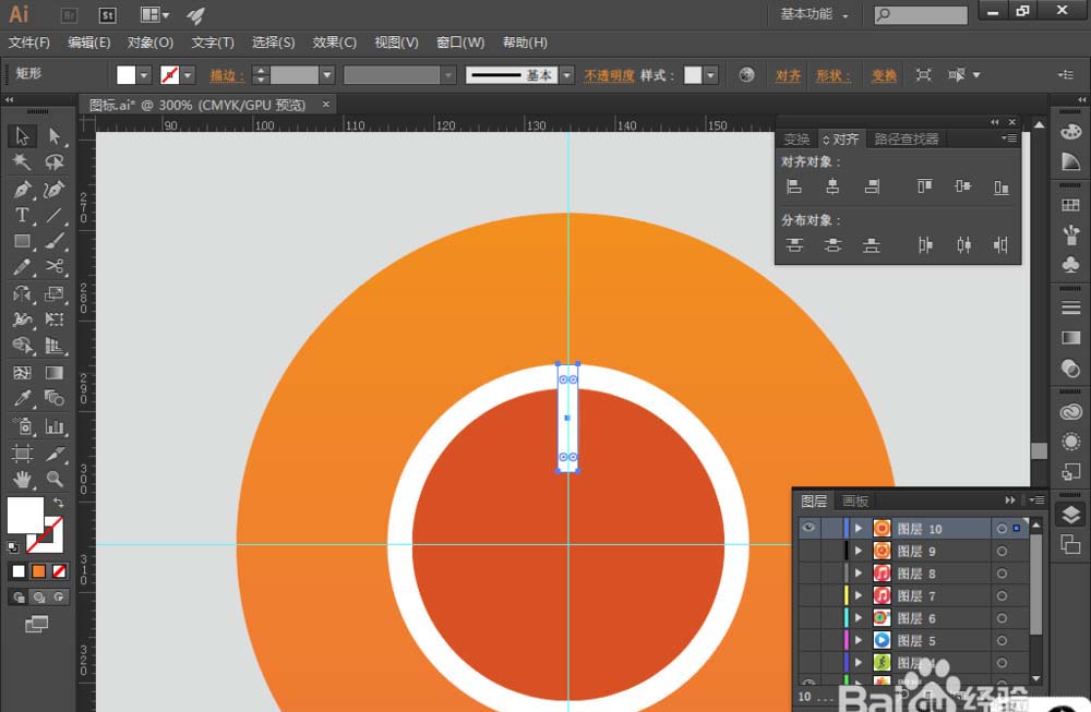 4、同时选择圆环、深橘色圆及圆形背景,找到【对齐】,选择【水平居中对齐】和【垂直居中分布】,让圆环、深橘色圆相对圆形背景水平垂直居中对齐,如图: