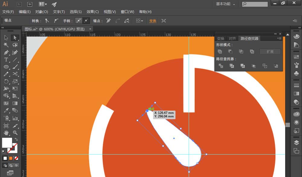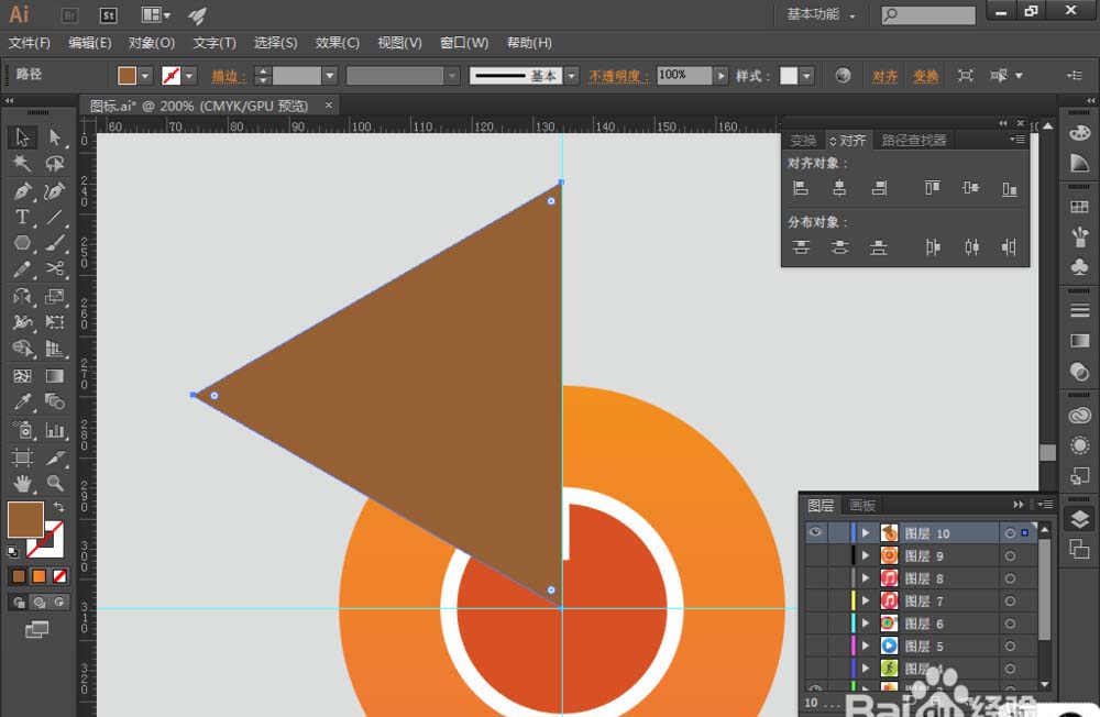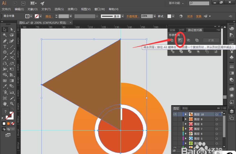8、同时选中三角形和白色圆形,找到【路径查找器】,选择【减去顶层】,得到如图中图形: