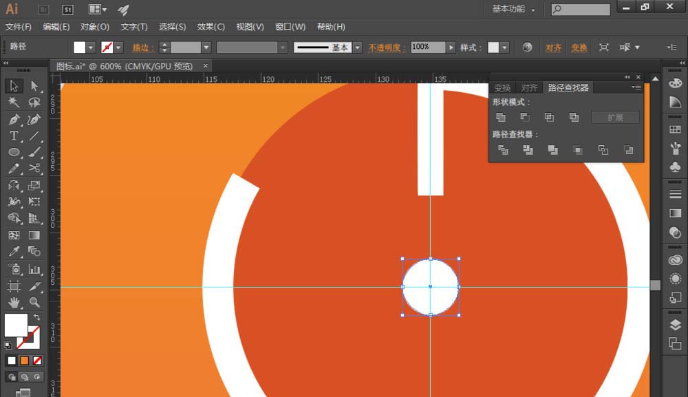 2、选择【椭圆工具】,首先创建一个的圆,在里面创建一个小圆,在复制一个小圆,先放一边不管。 在【路径查找器】中的选择【减去顶层】,创建一个圆环,如图: