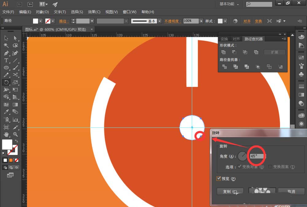 9、选择【椭圆工具】,绘制一个小圆,然后旋转这个圆,使它上面的锚点大约向左偏45度。