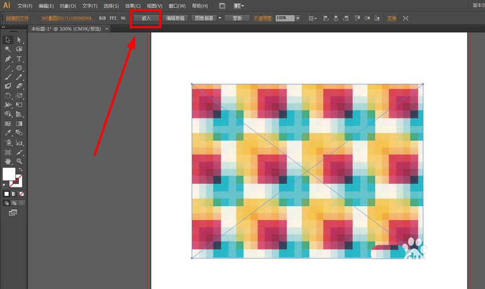 2、然后点击,如下图所示“嵌入”,就是将图片直接放入AI中,成为这个文档一个源文件,而不是链接的图片