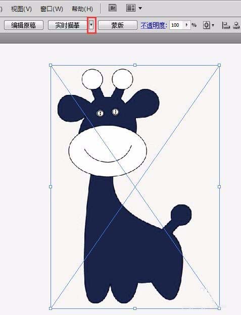 2、鼠标左键选中图片,然后找到软件上方控制面板中的实时描摹,在实时描摹右边有个三角形