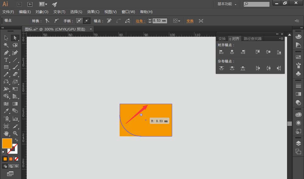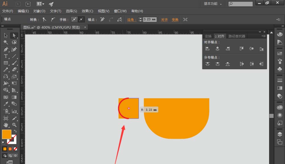 3、选择【矩形工具】,绘制一个矩形,选择【直接选择工具A】,同时选中矩形工具的左侧两个角的锚点,向右拖动,使这两个角变成圆角,作为杯子的“耳朵”,如图: