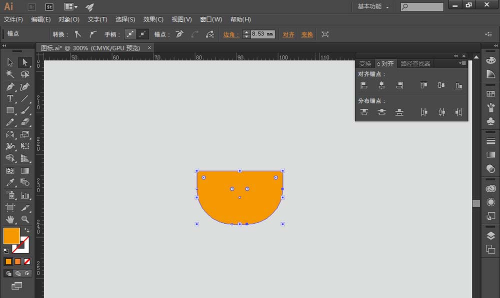 2、选择【直接选择工具A】,选中矩形左下角的锚点,沿中心点的方向拖动,使该角圆润化,如图1;同样选中矩形右下角的锚点,沿中心点的方向拖动,使该角圆润化,如图: