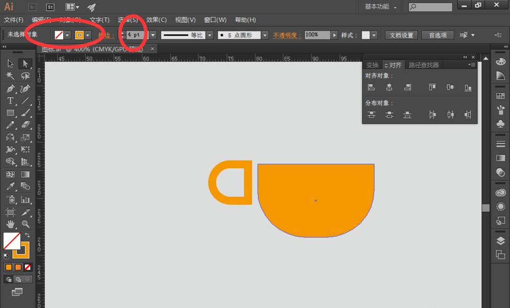 4、选择杯子“耳朵”,将其填充设置为无;然后描边设置为宽度为4pt,如图: