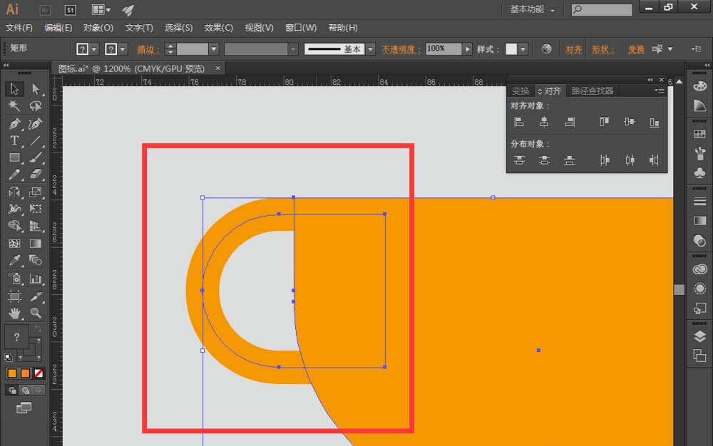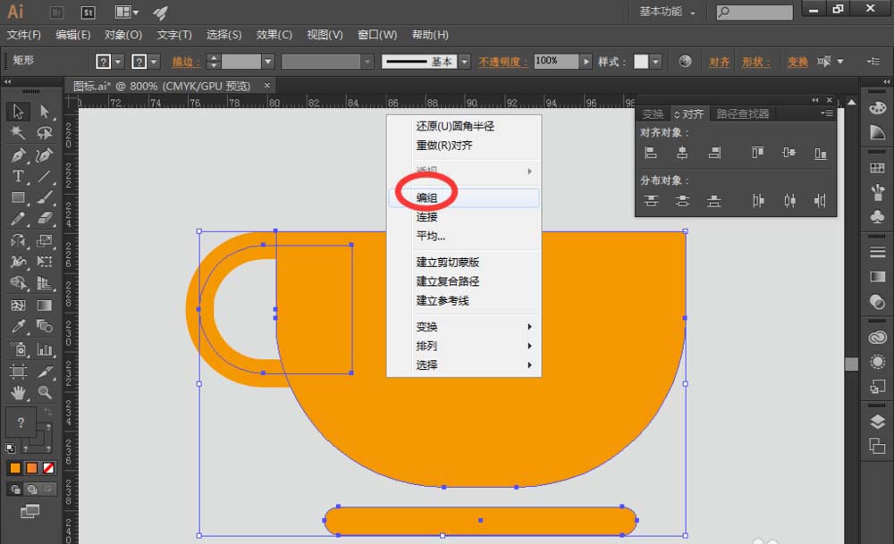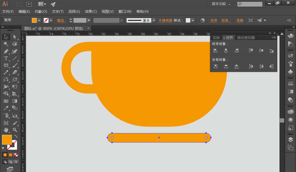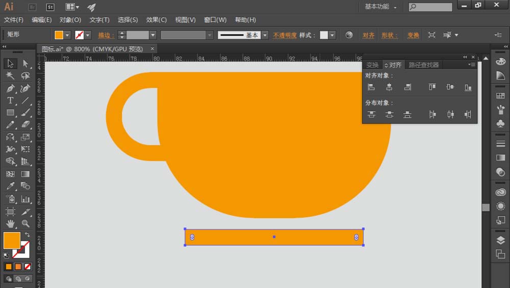 7、然后将该矩形放置在咖啡杯的“身体”下方合适的位置上;然后,找到【对齐】,选择【水平居中对齐】,让该矩形相对咖啡杯的“身体”水平居中对齐,如图: