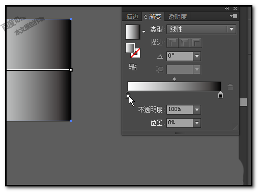 3、默认是白到黑的渐变。我们现在要从左边的画板中吸取颜色。鼠标点击渐变的颜色条,显示出渐变滑块;在左边这里的滑块点击下,选中该滑块。