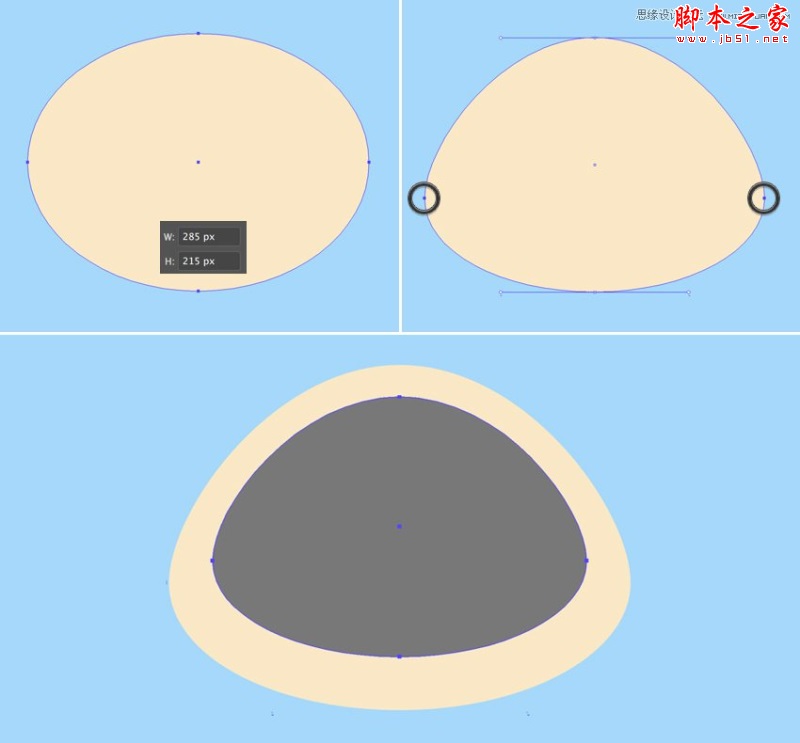 我们从头的基础开始。使用椭圆工具(L)制作一个285 x 215像素的浅米色椭圆形。 使用直接选择工具(A)选择其侧面锚点,并将它们向下拖动几个像素,使形状的底部稍微平坦一些。 您可以通过按住Shift键移动它们,或者用鼠标单击并拖动或使用键盘的向下箭头键。