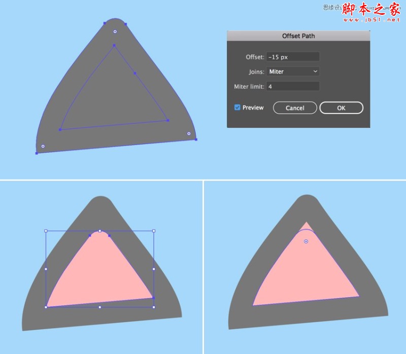 保持形状的选择,转到对象>路径>偏移路径,并将偏移值设置为-15像素,将所有其他选项设置为默认值。点击OK创建一个更小的三角形,并填充它为玫瑰粉色,从而创造耳朵的内部。