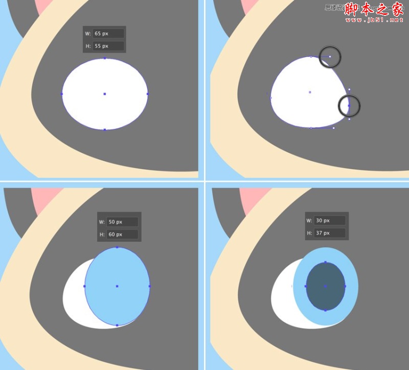 让我们继续画我们的人物。使用椭圆工具(L)制作一个65 x 55 像素的白色椭圆的眼球。 使用直接选择工具(A)缩短顶部锚点和右锚点顶部手柄的右手柄,使眼睛的右边缘更倾斜。